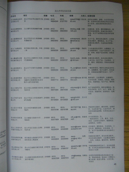 昆山外貿(mào)企業(yè)黃頁包括:外貿(mào)企業(yè)名稱、地址、電話、傳真、郵箱、經(jīng)營范圍、注冊資金等信息。