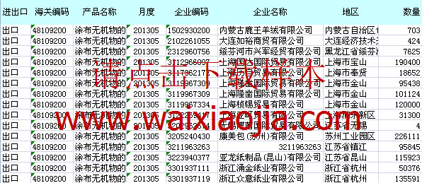 中國(guó)進(jìn)出口數(shù)據(jù)內(nèi)容包含進(jìn)口(出口) HS 海關(guān)編碼 商品名稱 月度 企業(yè)編碼 企業(yè)名稱 收發(fā)貨地 數(shù)量 金額 單位 產(chǎn)銷國(guó) 報(bào)關(guān)口岸 貿(mào)易方式 運(yùn)輸方式 中轉(zhuǎn)國(guó) 數(shù)量單位 電話 傳真 郵編 電子郵件 聯(lián)系人 企業(yè)性質(zhì) 企業(yè)地址 注冊(cè)日期 注冊(cè)海關(guān) 組織機(jī)構(gòu)代碼 報(bào)關(guān)有效期 行政區(qū)劃 信用等級(jí) 等等,是海關(guān)目前能夠提供給公眾最大限度的進(jìn)出口數(shù)據(jù)信息