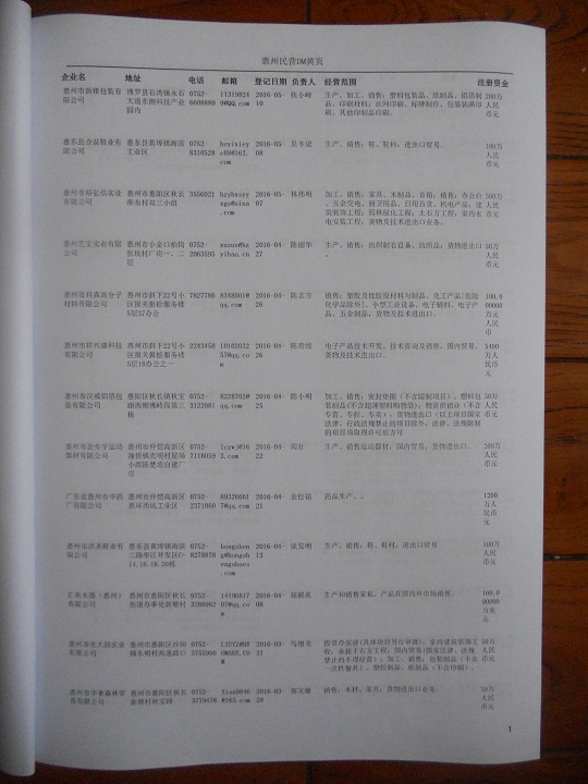 2021版最新惠州企業(yè)黃頁包括《惠州制造企業(yè)黃頁》、《惠州貿(mào)易企業(yè)黃頁》、《惠州民營企業(yè)黃頁》、《惠州外資企業(yè)黃頁》、《惠州外貿(mào)企業(yè)黃頁》共五冊,現(xiàn)優(yōu)惠價(jià):280元/冊。每冊內(nèi)容包括:單位名稱、地址、郵編、電話、傳真、郵箱、經(jīng)營范圍等;惠州企業(yè)黃頁涵蓋了近幾年來最新成立的、有一定規(guī)模的企業(yè),具有非常高的營銷價(jià)值。有了這套黃頁開展業(yè)務(wù)也有了針對性,也省去了盲目去尋找客戶名單而浪費(fèi)的時間了,工作效率也會有很大的提高。歡迎需要惠州企業(yè)黃頁的朋友及時聯(lián)系我們!