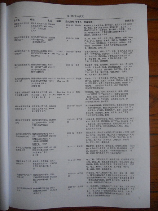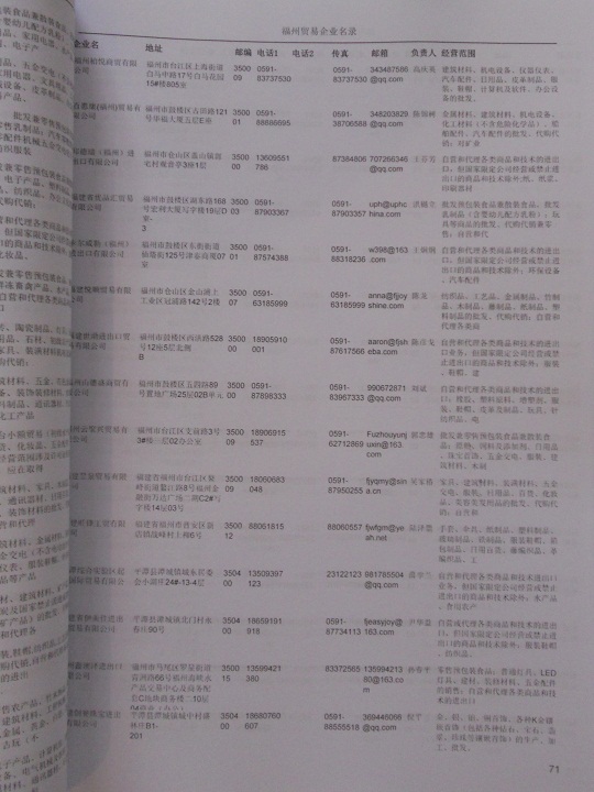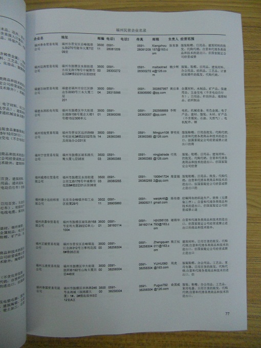 2021版最新福州企業(yè)黃頁(yè)包括《福州制造企業(yè)黃頁(yè)》、《福州貿(mào)易企業(yè)黃頁(yè)》、《福州民營(yíng)企業(yè)黃頁(yè)》、《福州外資企業(yè)黃頁(yè)》、《福州外貿(mào)企業(yè)黃頁(yè)》共五冊(cè),現(xiàn)優(yōu)惠價(jià):280元/冊(cè)。每?jī)?cè)內(nèi)容包括:?jiǎn)挝幻Q、地址、郵編、電話、傳真、郵箱、經(jīng)營(yíng)范圍等;福州企業(yè)黃頁(yè)涵蓋了近幾年來最新成立的、有一定規(guī)模的企業(yè),具有非常高的營(yíng)銷價(jià)值。有了這套黃頁(yè)開展業(yè)務(wù)也有了針對(duì)性,也省去了盲目去尋找客戶名單而浪費(fèi)的時(shí)間了,工作效率也會(huì)有很大的提高。歡迎需要福州企業(yè)黃頁(yè)的朋友及時(shí)聯(lián)系我們!