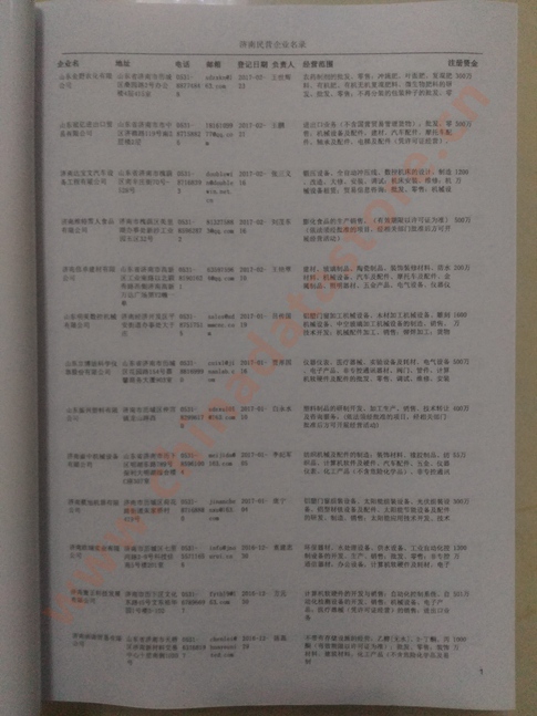2021版最新濟(jì)南企業(yè)黃頁包括《濟(jì)南制造企業(yè)黃頁》、《濟(jì)南貿(mào)易企業(yè)黃頁》、《濟(jì)南民營(yíng)企業(yè)黃頁》、《濟(jì)南外資企業(yè)黃頁》、《濟(jì)南外貿(mào)企業(yè)黃頁》共五冊(cè),現(xiàn)優(yōu)惠價(jià):280元/冊(cè)。每?jī)?cè)內(nèi)容包括:?jiǎn)挝幻Q、地址、郵編、電話、傳真、郵箱、經(jīng)營(yíng)范圍等;濟(jì)南企業(yè)黃頁涵蓋了近幾年來最新成立的、有一定規(guī)模的企業(yè),具有非常高的營(yíng)銷價(jià)值。有了這套黃頁開展業(yè)務(wù)也有了針對(duì)性,也省去了盲目去尋找客戶名單而浪費(fèi)的時(shí)間了,工作效率也會(huì)有很大的提高。歡迎需要濟(jì)南企業(yè)黃頁的朋友及時(shí)聯(lián)系我們!