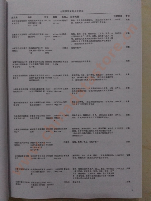 2024年新版中國(guó)服裝采購(gòu)企業(yè)黃頁(yè),收錄了全國(guó)各地經(jīng)營(yíng)范圍涉及服裝產(chǎn)品的貿(mào)易企業(yè),這些都是頗具實(shí)力的服裝產(chǎn)品的中國(guó)采購(gòu)商。黃頁(yè)內(nèi)容包含:企業(yè)名稱、地址、電話、傳真、郵箱、經(jīng)營(yíng)范圍、省份、注冊(cè)資金等信息。該套黃頁(yè)包含一個(gè)黃頁(yè)光碟加一冊(cè)紙質(zhì)書(shū)刊,全國(guó)的價(jià)格:1500元,省/直轄市價(jià)格:400元,城市價(jià)格:200元,共收錄了全國(guó)各地大概46646(統(tǒng)計(jì)日期:2018.1)服裝裝產(chǎn)品采購(gòu)企業(yè)。黃頁(yè)光碟中是EXCEL格式,信息可任意修改、復(fù)制、打印、導(dǎo)出及導(dǎo)入到傳真、郵件群發(fā)等軟件中,無(wú)任何限制。