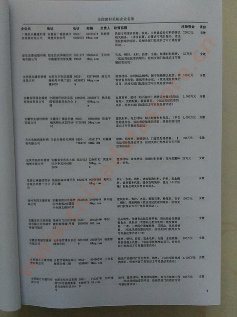 2024年新版中國建材采購企業(yè)黃頁,收錄了全國各地經(jīng)營范圍涉及建材產(chǎn)品的貿(mào)易企業(yè),這些都是頗具實力的建材產(chǎn)品的中國采購商。黃頁內(nèi)容包含:企業(yè)名稱、地址、電話、傳真、郵箱、經(jīng)營范圍、省份、注冊資金等信息。該套黃頁包含一個黃頁光碟加一冊紙質(zhì)書刊,全國價格:1500元,省/直轄市價格:400元,城市價格:200元,共收錄了全國各地大概111371(統(tǒng)計日期:2018.1)家建材產(chǎn)品采購企業(yè)。黃頁光碟中是EXCEL格式,信息可任意修改、復(fù)制、打印、導(dǎo)出及導(dǎo)入到傳真、郵件群發(fā)等軟件中,無任何限制。