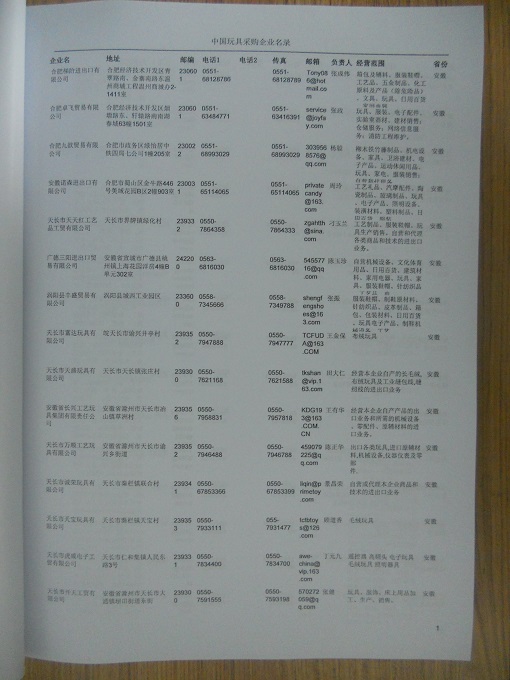 2024年新版中國(guó)玩具采購(gòu)企業(yè)黃頁(yè),收錄了全國(guó)各地經(jīng)營(yíng)范圍涉及玩具產(chǎn)品的貿(mào)易企業(yè),這些都是頗具實(shí)力的玩具產(chǎn)品的中國(guó)采購(gòu)商。黃頁(yè)內(nèi)容包含:企業(yè)名稱、地址、電話、傳真、郵箱、經(jīng)營(yíng)范圍、省份、注冊(cè)資金等信息。該套黃頁(yè)包含一個(gè)黃頁(yè)光碟加一冊(cè)紙質(zhì)書刊,全國(guó)價(jià)格:1500元,省/直轄市價(jià)格:400元,城市價(jià)格:200元,共收錄了全國(guó)各地大概1852(統(tǒng)計(jì)日期:2018.1)家玩具產(chǎn)品采購(gòu)企業(yè)。黃頁(yè)光碟中是EXCEL格式,信息可任意修改、復(fù)制、打印、導(dǎo)出及導(dǎo)入到傳真、郵件群發(fā)等軟件中,無(wú)任何限制。