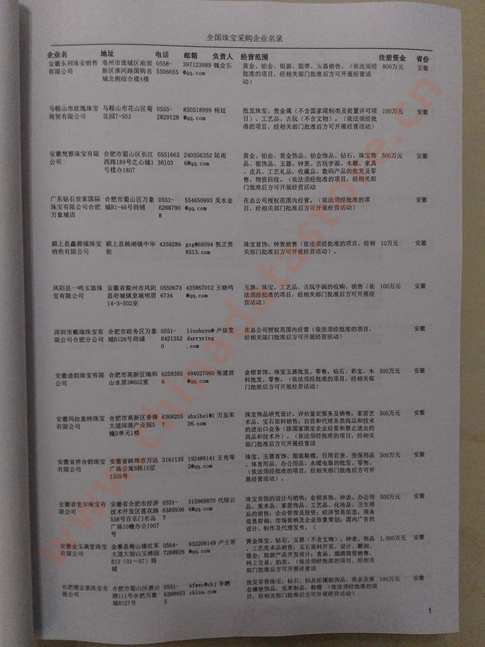 2024年新版中國(guó)珠寶采購(gòu)企業(yè)黃頁(yè),收錄了全國(guó)各地經(jīng)營(yíng)范圍涉及珠寶產(chǎn)品的貿(mào)易企業(yè),這些都是頗具實(shí)力的珠寶產(chǎn)品的中國(guó)采購(gòu)商。黃頁(yè)內(nèi)容包含:企業(yè)名稱、地址、電話、傳真、郵箱、經(jīng)營(yíng)范圍、省份、注冊(cè)資金等信息。該套黃頁(yè)包含一個(gè)黃頁(yè)光碟加一冊(cè)紙質(zhì)書刊,全國(guó)價(jià)格:1500元,省/直轄市價(jià)格:400元,城市價(jià)格:200元,共收錄了全國(guó)各地大概44763(統(tǒng)計(jì)日期:2018.1)家珠寶產(chǎn)品采購(gòu)企業(yè)。黃頁(yè)光碟中是EXCEL格式,信息可任意修改、復(fù)制、打印、導(dǎo)出及導(dǎo)入到傳真、郵件群發(fā)等軟件中,無任何限制。
