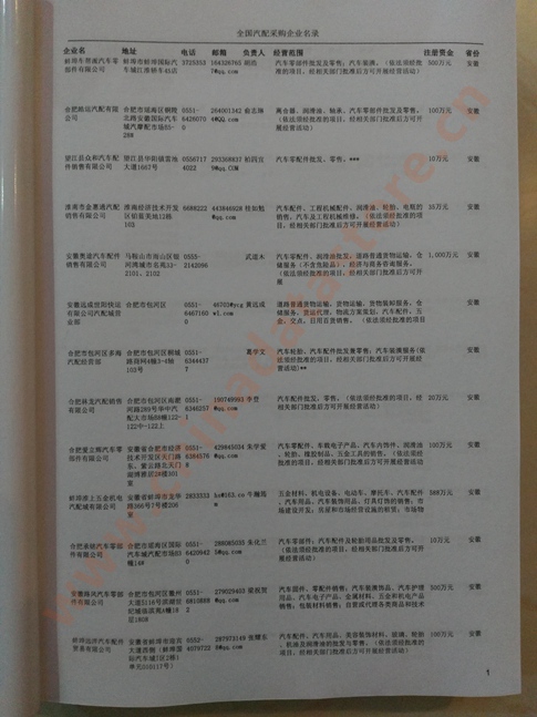 2024年新版中國(guó)汽配采購(gòu)企業(yè)黃頁(yè),收錄了全國(guó)各地經(jīng)營(yíng)范圍涉及汽配產(chǎn)品的貿(mào)易企業(yè),這些都是頗具實(shí)力的汽配產(chǎn)品的中國(guó)采購(gòu)商。黃頁(yè)內(nèi)容包含:企業(yè)名稱、地址、電話、傳真、郵箱、經(jīng)營(yíng)范圍、省份、注冊(cè)資金等信息。該套黃頁(yè)包含一個(gè)黃頁(yè)光碟加一冊(cè)紙質(zhì)書刊,全國(guó)價(jià)格:1500元,省/直轄市價(jià)格:400元,城市價(jià)格:200元,共收錄了全國(guó)各地大概8952(統(tǒng)計(jì)日期:2018.1)家汽配產(chǎn)品采購(gòu)企業(yè)。黃頁(yè)光碟中是EXCEL格式,信息可任意修改、復(fù)制、打印、導(dǎo)出及導(dǎo)入到傳真、郵件群發(fā)等軟件中,無任何限制。