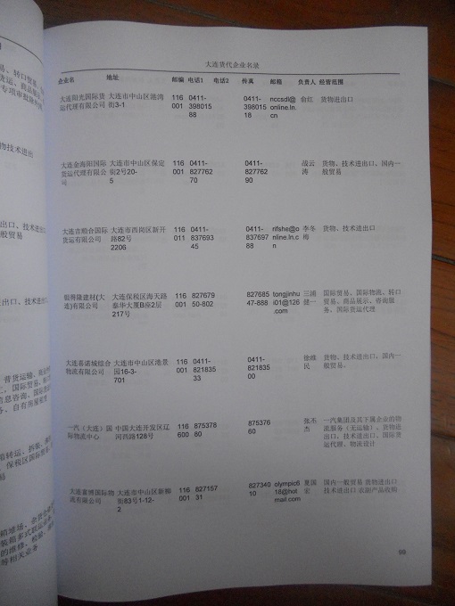 大連貨運公司黃頁包括:企業(yè)名稱、負(fù)責(zé)人聯(lián)系方式、企業(yè)電話、傳真、Email、經(jīng)營范圍、地址、郵編等信息。