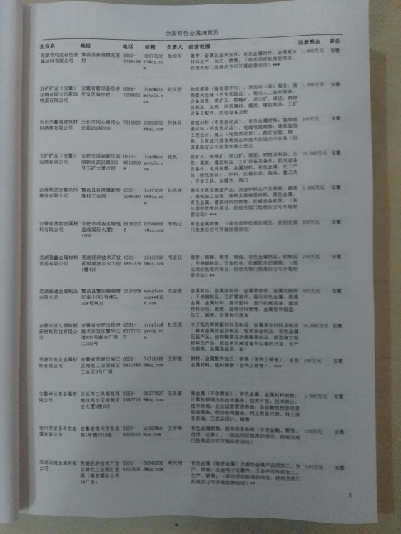 最新有色金屬生產與貿易企業(yè)黃頁數(shù)據(jù)更新日期2024年12月最新,全國金屬材料企業(yè)名單共15770條,都是具有一定規(guī)模的金屬材料行業(yè)的注冊實體企業(yè),數(shù)據(jù)準確率高,是您開展各項營銷活動的必備資料。金屬材料企業(yè)黃頁包括:企業(yè)名稱、地址、電話、傳真、郵箱、登記日期、經營范圍、注冊資金等信息。金屬材料企業(yè)名單數(shù)據(jù)為Excel格式,信息可任意修改、復制、打印、導出及導入到傳真、郵件群發(fā)等軟件中,無任何限制。
