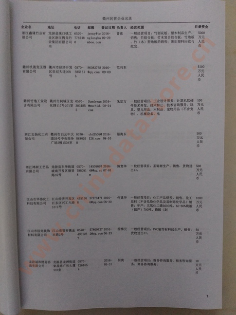 2021版最新衢州企業(yè)黃頁包括《衢州制造企業(yè)黃頁》、《衢州民營企業(yè)黃頁》,現(xiàn)優(yōu)惠價(jià):280元/冊。每冊內(nèi)容包括:單位名稱、地址、郵編、電話、傳真、郵箱、經(jīng)營范圍等;衢州企業(yè)黃頁涵蓋了近幾年來最新成立的、有一定規(guī)模的企業(yè),具有非常高的營銷價(jià)值。有了這套黃頁開展業(yè)務(wù)也有了針對性,也省去了盲目去尋找客戶名單而浪費(fèi)的時(shí)間了,工作效率也會(huì)有很大的提高。歡迎需要衢州企業(yè)黃頁的朋友及時(shí)聯(lián)系我們!