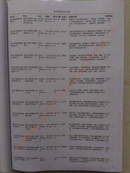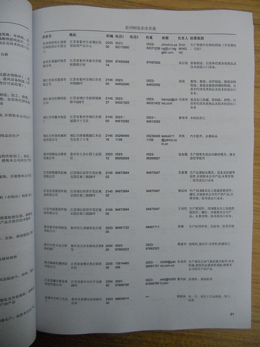 2021版最新泰州企業(yè)黃頁包括《泰州制造企業(yè)黃頁》、《泰州民營企業(yè)黃頁》,現(xiàn)優(yōu)惠價:280元/冊。每冊內容包括:單位名稱、地址、郵編、電話、傳真、郵箱、經(jīng)營范圍等;泰州企業(yè)黃頁涵蓋了近幾年來最新成立的、有一定規(guī)模的企業(yè),具有非常高的營銷價值。有了這套黃頁開展業(yè)務也有了針對性,也省去了盲目去尋找客戶名單而浪費的時間了,工作效率也會有很大的提高。歡迎需要泰州企業(yè)黃頁的朋友及時聯(lián)系我們!