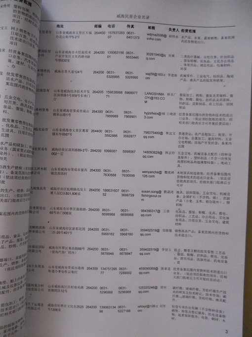 2021版最新威海企業(yè)黃頁(yè)包括《威海制造企業(yè)黃頁(yè)》、《威海民營(yíng)企業(yè)黃頁(yè)》,現(xiàn)優(yōu)惠價(jià):280元/冊(cè)。每?jī)?cè)內(nèi)容包括:?jiǎn)挝幻Q(chēng)、地址、郵編、電話、傳真、郵箱、經(jīng)營(yíng)范圍等;威海企業(yè)黃頁(yè)涵蓋了近幾年來(lái)最新成立的、有一定規(guī)模的企業(yè),具有非常高的營(yíng)銷(xiāo)價(jià)值。有了這套黃頁(yè)開(kāi)展業(yè)務(wù)也有了針對(duì)性,也省去了盲目去尋找客戶名單而浪費(fèi)的時(shí)間了,工作效率也會(huì)有很大的提高。歡迎需要威海企業(yè)黃頁(yè)的朋友及時(shí)聯(lián)系我們!