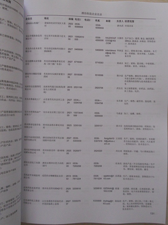 2021版最新濰坊企業(yè)黃頁包括《濰坊制造企業(yè)黃頁》、《濰坊民營企業(yè)黃頁》,現(xiàn)優(yōu)惠價:280元/冊。每冊內(nèi)容包括:單位名稱、地址、郵編、電話、傳真、郵箱、經(jīng)營范圍等;濰坊企業(yè)黃頁涵蓋了近幾年來最新成立的、有一定規(guī)模的企業(yè),具有非常高的營銷價值。有了這套黃頁開展業(yè)務也有了針對性,也省去了盲目去尋找客戶名單而浪費的時間了,工作效率也會有很大的提高。歡迎需要濰坊企業(yè)黃頁的朋友及時聯(lián)系我們!