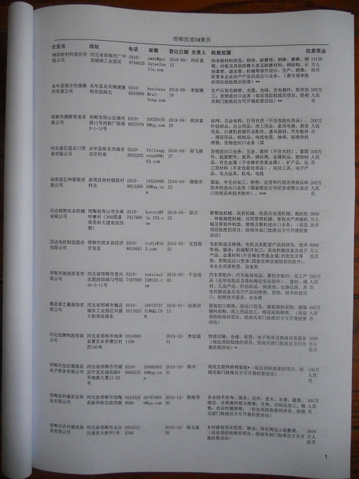 2021版最新邯鄲企業(yè)黃頁包括《邯鄲制造企業(yè)黃頁》、《邯鄲民營企業(yè)黃頁》,現(xiàn)優(yōu)惠價(jià):280元/冊。每冊內(nèi)容包括:單位名稱、地址、郵編、電話、傳真、郵箱、經(jīng)營范圍等;邯鄲企業(yè)黃頁涵蓋了近幾年來最新成立的、有一定規(guī)模的企業(yè),具有非常高的營銷價(jià)值。有了這套黃頁開展業(yè)務(wù)也有了針對性,也省去了盲目去尋找客戶名單而浪費(fèi)的時(shí)間了,工作效率也會(huì)有很大的提高。歡迎需要邯鄲企業(yè)黃頁的朋友及時(shí)聯(lián)系我們!