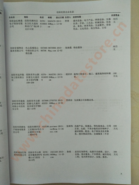 2021版最新信陽企業(yè)黃頁包括《信陽制造企業(yè)黃頁》、《信陽民營企業(yè)黃頁》,現(xiàn)優(yōu)惠價(jià):280元/冊。每冊內(nèi)容包括:單位名稱、地址、郵編、電話、傳真、郵箱、經(jīng)營范圍等;信陽企業(yè)黃頁涵蓋了近幾年來最新成立的、有一定規(guī)模的企業(yè),具有非常高的營銷價(jià)值。有了這套黃頁開展業(yè)務(wù)也有了針對性,也省去了盲目去尋找客戶名單而浪費(fèi)的時(shí)間了,工作效率也會有很大的提高。歡迎需要信陽企業(yè)黃頁的朋友及時(shí)聯(lián)系我們!
