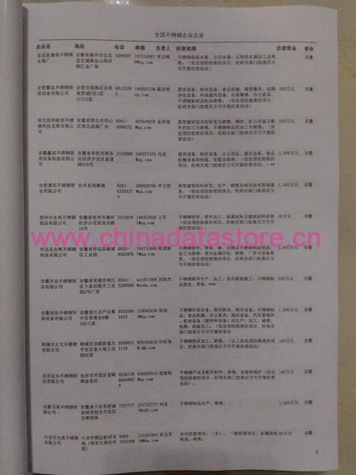 最新不銹鋼生產(chǎn)與貿(mào)易企業(yè)黃頁數(shù)據(jù)更新日期2024年12月最新,全國不銹鋼企業(yè)黃頁共111380條,都是具有一定規(guī)模的不銹鋼行業(yè)的注冊實體企業(yè),數(shù)據(jù)準確率高,是您開展各項營銷活動的必備資料。企業(yè)名單包括:企業(yè)名稱、地址、電話(以上必有,以下選有)、傳真、郵箱、登記日期、經(jīng)營范圍、注冊資金等信息。不銹鋼企業(yè)黃頁數(shù)據(jù)為Excel格式,信息可任意修改、復(fù)制、打印、導(dǎo)出及導(dǎo)入到傳真、郵件群發(fā)等軟件中,無任何限制。