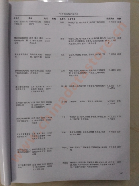 最新鋼結(jié)構(gòu)生產(chǎn)與貿(mào)易企業(yè)黃頁(yè)數(shù)據(jù)更新日期2024年12月最新,全國(guó)鋼結(jié)構(gòu)企業(yè)名單共12000條,都是具有一定規(guī)模的鋼結(jié)構(gòu)行業(yè)的注冊(cè)實(shí)體企業(yè),數(shù)據(jù)準(zhǔn)確率高,是您開展各項(xiàng)營(yíng)銷活動(dòng)的必備資料。鋼結(jié)構(gòu)企業(yè)黃頁(yè)包括:企業(yè)名稱、地址、電話、傳真、郵箱、登記日期、經(jīng)營(yíng)范圍、注冊(cè)資金等信息。鋼結(jié)構(gòu)企業(yè)名單數(shù)據(jù)為Excel格式,信息可任意修改、復(fù)制、打印、導(dǎo)出及導(dǎo)入到傳真、郵件群發(fā)等鋼結(jié)構(gòu)中,無任何限制。