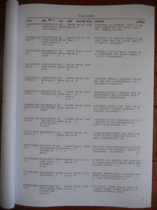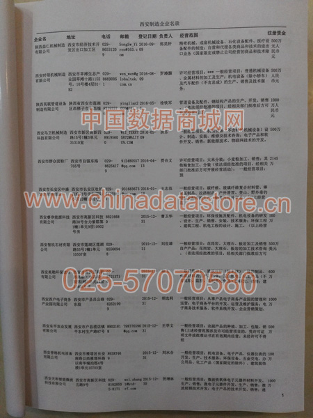 2021版最新西安企業(yè)黃頁包括《西安制造企業(yè)黃頁》、《西安民營企業(yè)黃頁》,現(xiàn)優(yōu)惠價:280元/冊。每冊內(nèi)容包括:單位名稱、地址、郵編、電話、傳真、郵箱、經(jīng)營范圍等;西安企業(yè)黃頁涵蓋了近幾年來最新成立的、有一定規(guī)模的企業(yè),具有非常高的營銷價值。有了這套黃頁開展業(yè)務(wù)也有了針對性,也省去了盲目去尋找客戶名單而浪費(fèi)的時間了,工作效率也會有很大的提高。歡迎需要西安企業(yè)黃頁的朋友及時聯(lián)系我們!