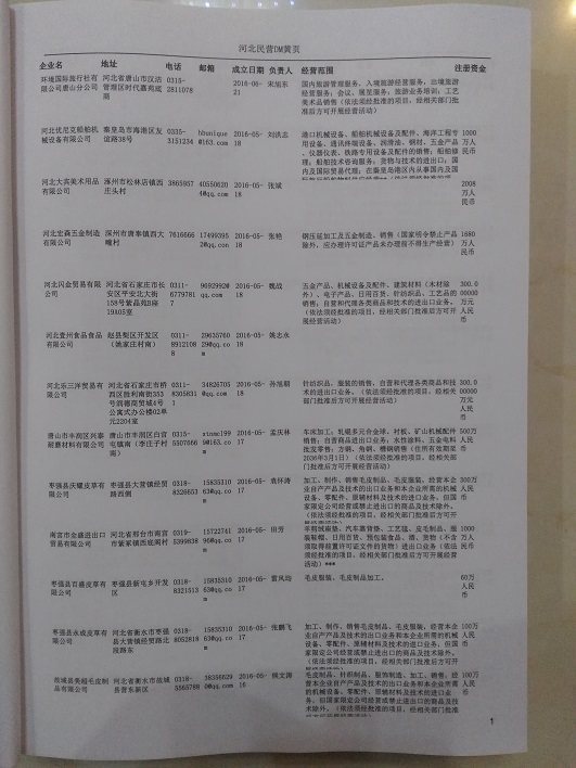 2021版最新河北企業(yè)黃頁包括《河北制造企業(yè)黃頁》、《河北貿易企業(yè)黃頁》、《河北民營企業(yè)黃頁》共三冊,優(yōu)惠價:280元/冊。每冊內容包括:單位名稱、地址、郵編、電話、傳真、郵箱、經(jīng)營范圍等;河北企業(yè)黃頁涵蓋了近幾年來最新成立的、有一定規(guī)模的企業(yè),具有非常高的營銷價值。有了這套黃頁開展業(yè)務也有了針對性,也省去了盲目去尋找客戶名單而浪費的時間了,工作效率也會有很大的提高。歡迎需要河北企業(yè)黃頁的朋友及時聯(lián)系我們!