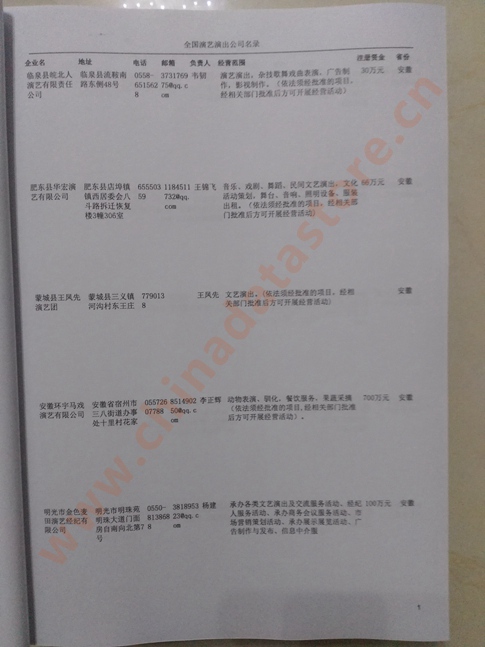 | 全國演藝演出企業(yè)黃頁 | 全國所有演藝演出企業(yè)黃頁 | 80% - 90% | 2000元 | 附贈(zèng)上下冊(cè)演藝演出紙質(zhì)印刷品 |