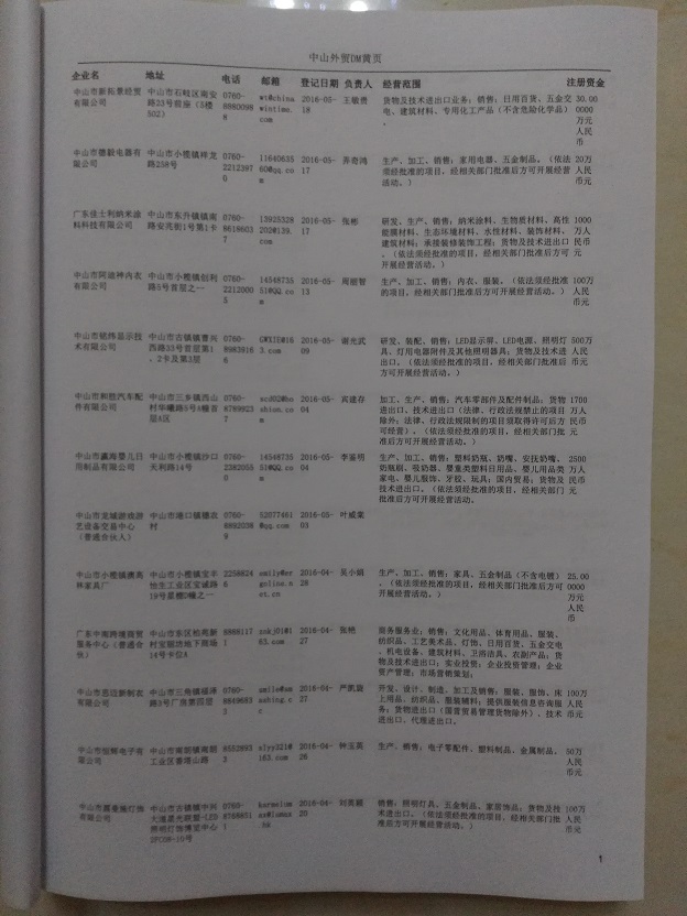 中山外貿(mào)企業(yè)黃頁(yè)包括:外貿(mào)企業(yè)名稱、地址、電話、傳真、郵箱、經(jīng)營(yíng)范圍、注冊(cè)資金等信息。