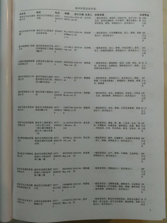 溫州外貿(mào)企業(yè)黃頁包括:外貿(mào)企業(yè)名稱、地址、電話、傳真、郵箱、經(jīng)營范圍、注冊(cè)資金等信息。