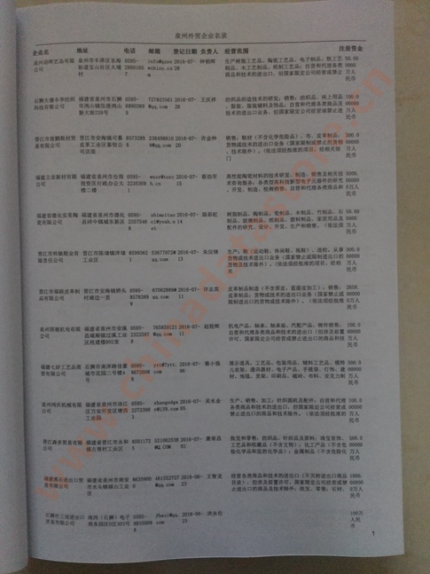 泉州外貿(mào)企業(yè)黃頁(yè)包括:外貿(mào)企業(yè)名稱、地址、電話、傳真、郵箱、經(jīng)營(yíng)范圍、注冊(cè)資金等信息。