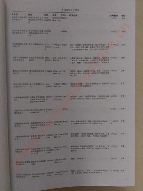 陶瓷外貿(mào)企業(yè)黃頁(yè)包括:外貿(mào)企業(yè)名稱、地址、電話、傳真、郵箱、經(jīng)營(yíng)范圍、注冊(cè)資金等信息。