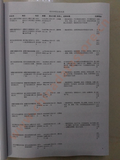 紹興外貿(mào)企業(yè)黃頁包括:外貿(mào)企業(yè)名稱、地址、電話、傳真、郵箱、經(jīng)營范圍、注冊(cè)資金等信息。