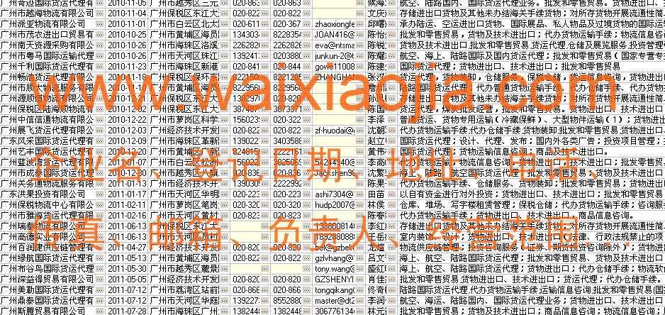 廣州貨運代理公司名單數(shù)據(jù)為Excel格式,信息可任意修改、復制、打印、導出及導入到傳真、郵件群發(fā)等軟件中,無任何限制。