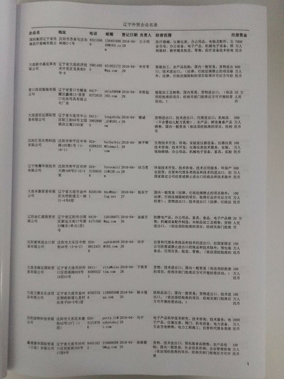 遼寧外貿(mào)企業(yè)黃頁包括:外貿(mào)企業(yè)名稱、地址、電話、傳真、郵箱、經(jīng)營范圍、注冊資金等信息。