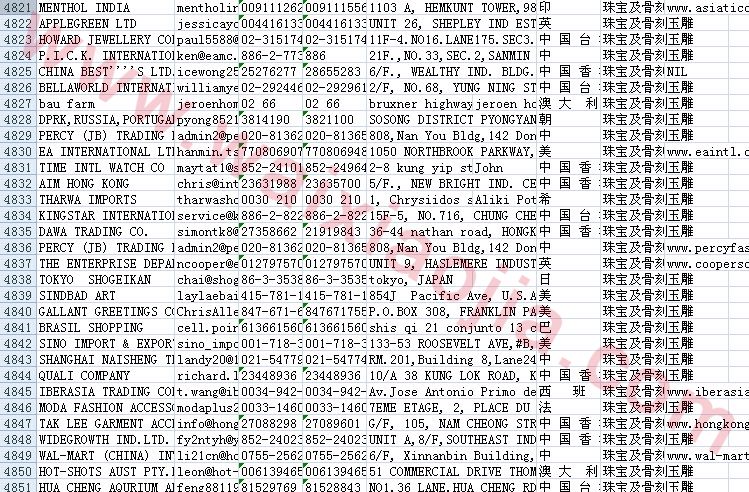 珠寶首飾采購(gòu)商名單數(shù)據(jù)為Excel格式,信息可任意修改、復(fù)制、打印、導(dǎo)出及導(dǎo)入到傳真、郵件群發(fā)等軟件中,無(wú)任何限制。