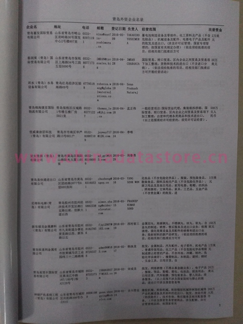 最新青島外資企業(yè)黃頁涵蓋了青島外商獨資企業(yè)、中外合資經(jīng)營企業(yè)以及港、澳、臺資企業(yè),包括青島臺資日資企業(yè)黃頁,青島外企黃頁具體內(nèi)容包括:企業(yè)名稱、地址、電話、傳真、郵箱、經(jīng)營范圍、注冊資金等信息;青島外企黃頁里面的企業(yè)都一些中外合資的大企業(yè),這些公司經(jīng)濟實力都比較雄厚,出口產(chǎn)品也比較多,業(yè)務范圍都比較廣,跟他們開展業(yè)務往來都比較容易;有了青島日企臺企黃頁開展業(yè)務也有了針對性,也省去了盲目去尋找客戶名單而浪費的時間了,工作效率也會有很大的提高.歡迎需要青島外資公司黃頁的客戶及時聯(lián)系我們!